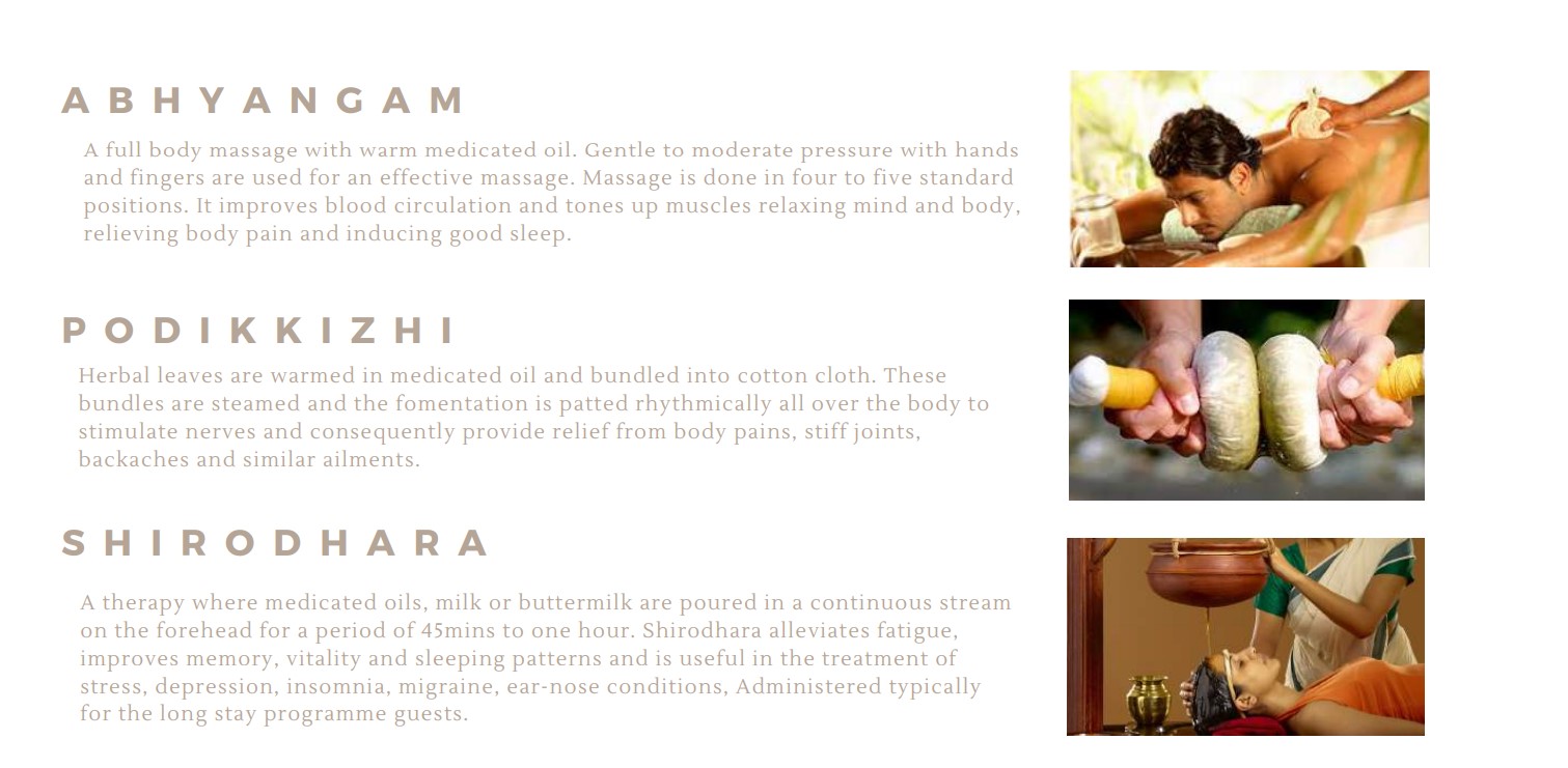 Ayurvedic therapies improve systemic circulation associated with stress and induction of sleep, and helps you attain a calm temperance of mind. Internal medication combined with Yoga and classical Ayurvedic treatments like Sirodhara, Thakradhara, Siroabyangam, Uzhichil, Sirovasthy etc. combat not just the symptom, but root causes of stress that seem to partner today’s hectic lifestyles.