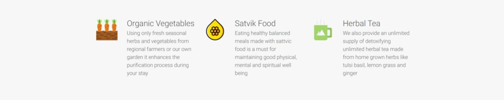 In addition to serving healthy, soulful and delicious vegetarian meals,  there is also an unlimited supply of detoxifying herbal tea made from home grown herbs like tulsi (basil), lemon grass and ginger. This refreshing tea, available throughout the day, is a great detox drink for the body, keeps one well-hydrated and is designed to support the digestive process.
